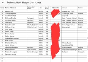 बिलासपुर। छत्तीसगढ़ के बिलासपुर में हुए दर्दनाक रेल हादसे ने पूरे प्रदेश को झकझोर कर रख दिया है। जिला प्रशासन ने मृतकों और घायलों की सूची जारी कर दी है। आधिकारिक आंकड़ों के अनुसार हादसे में अब तक 6 यात्रियों की मौत हुई है, जबकि 20 से अधिक लोग घायल हैं। सभी घायलों का इलाज शहर के विभिन्न अस्पतालों में किया जा रहा है।