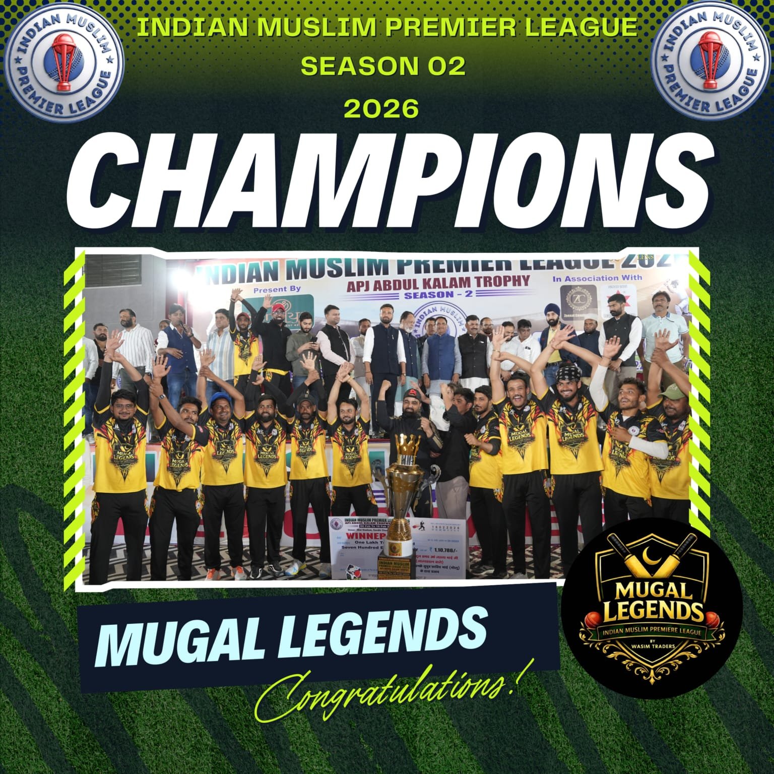 बिलासपुर। Indian Muslim Premier League के सीजन-2 का समापन बेहद रोमांचक अंदाज़ में हुआ। फाइनल मुकाबले में मुगल लीजेंड्स ने शानदार खेल दिखाते हुए अल हिंद लायंस को 17 रनों से हराकर एपीजे अब्दुल कलाम ट्रॉफी अपने नाम कर ली। जीत के साथ ही टीम ने इतिहास रच दिया और पूरे टूर्नामेंट में अपनी मजबूत पकड़ साबित की।